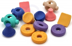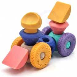 Dijelovi se jednostavno povezuju i slažu u različite konstrukcije – od jednostavnih tornjeva do zabavnih vozila poput “trkaćeg autića”. Set je idealan za igru, učenje i grickanje u razdoblju nicanja zubića. Praktično pakiranje u kartonskoj kutiji s prozorčićem čini ga sjajnim poklonom za bebe od 6 mjeseci.