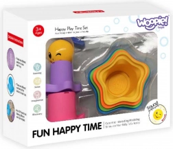 Šarena slagalica piramida WOOPIE sa čašicama u obliku zvjezdica i nasmiješenom lopticom potiče finu motoriku, koordinacijske vještine i prepoznavanje boja i oblika. Izdržljiva, sigurna i netoksična plastika, zaobljeni oblici i zaigran dizajn za radosno učenje kroz igru.