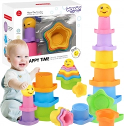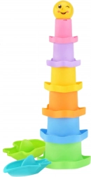 Ova senzorička piramida u bojama duge sadrži čašice različitih veličina u obliku zvjezdica i veselu lopticu s tiskom. Djeca vježbaju hvat, razvrstavanje prema veličini i logičko razmišljanje dok slažu i ruše toranj ili istražuju pojedine dijelove.