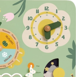 Drveni kalendar omogućuje djeci da samostalno podešavaju datum, mjesec i godišnje doba, što pomaže razvijati njihove motoričke vještine.