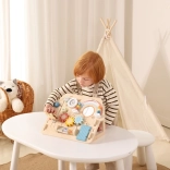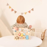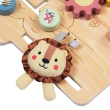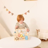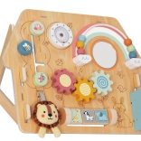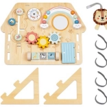 Aktivna ploča u obliku kućice s motivom lavljaka stimulira osjetilno opažanje djece zahvaljujući blagim bojama, simpatičnim slikama i različitim teksturama površina. Djeca vole aktivnosti kao što su labirint s kuglicama, rotirajuće i klizne pločice sa slikama životinja. Ova ploča za igru također potiče koordinaciju ruka-oko i maštu.
