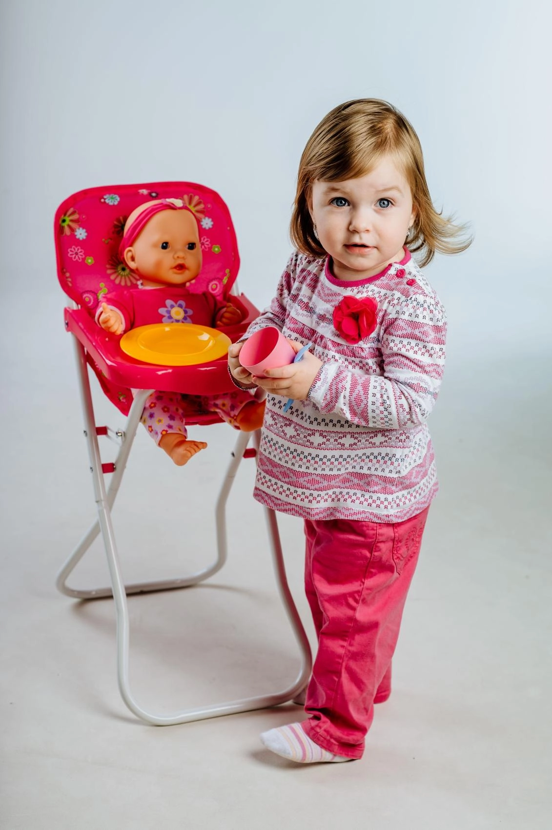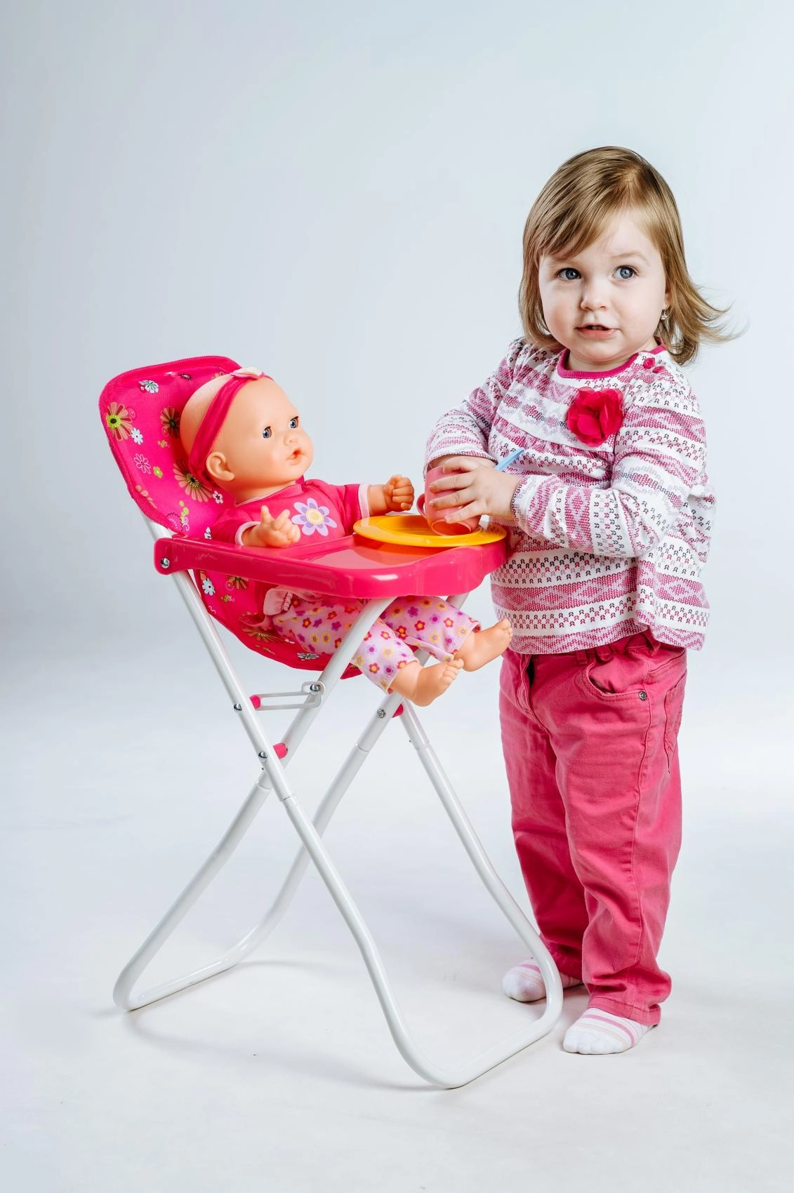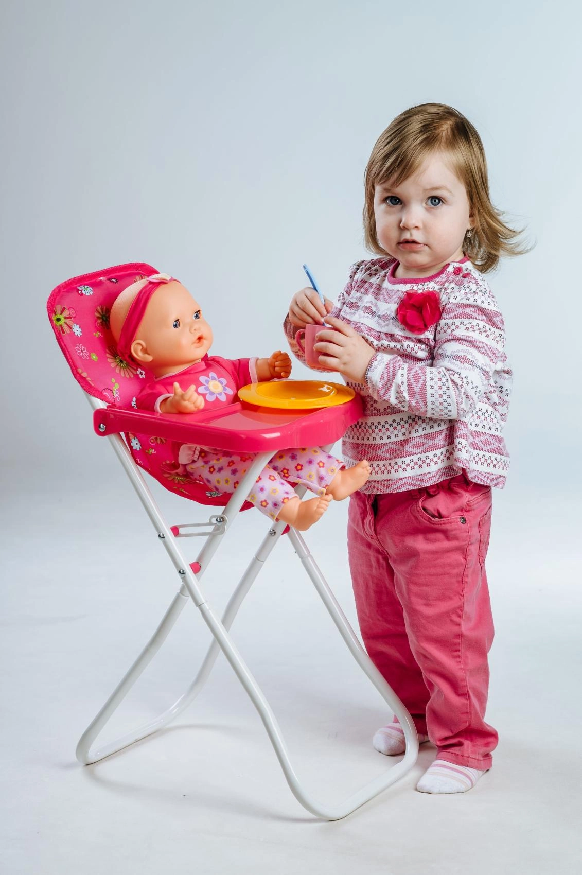 Ova visoka stolica za lutke razveselit će sve male njegovateljice. Nudi udobno sjedenje s cvjetnim presvlakama, praktični plastični pladanj za hranjenje te laganu, ali stabilnu metalnu konstrukciju. Zahvaljujući sklopivom dizajnu lako se prenosi i odlaže.