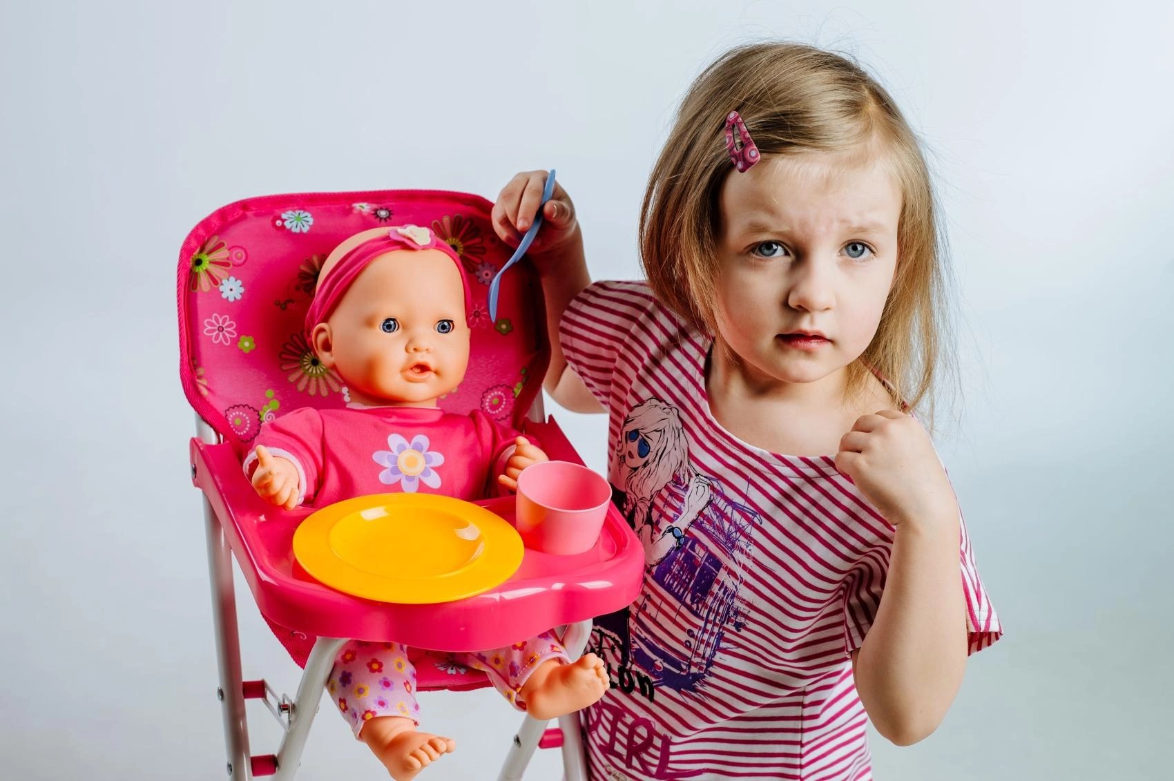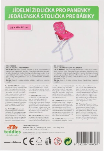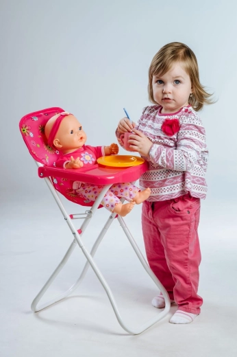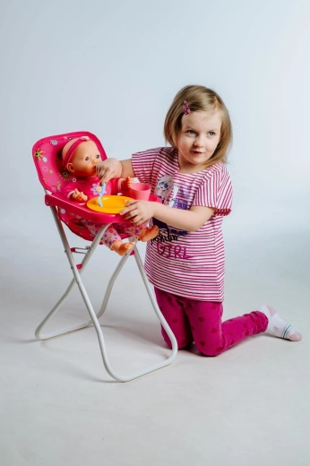 Stilska visoka stolica za lutke sa stabilnom metalnom konstrukcijom i plastičnim pladnjem s držačem za čašu. Zahvaljujući sklopivom dizajnu, laganoj izradi i lakom održavanju idealna je za svakodnevnu igru. Dimenzije 33 × 26 × 60 cm. Prikladna za djecu od 3 godine.