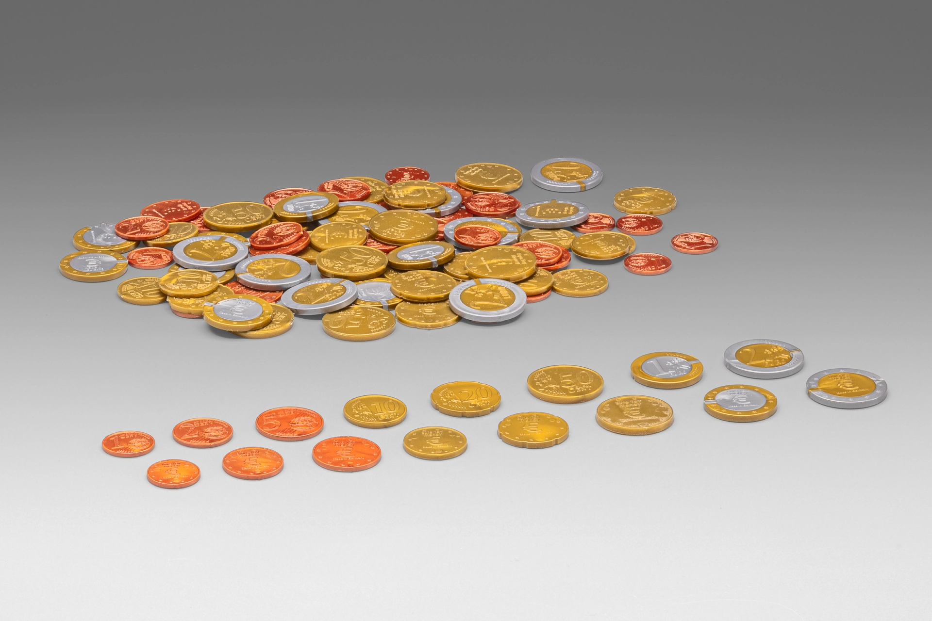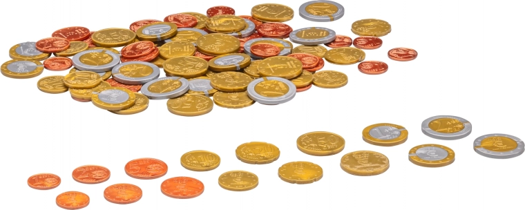 Kovanice su izrađene od 100% reciklirajuće plastike, što čuva okoliš. Svako pakiranje sadrži 80 kovanica različitih vrijednosti (od 1 centa do 2 eura), pa se djeca mogu veseliti realističnojoj igri s novcem.