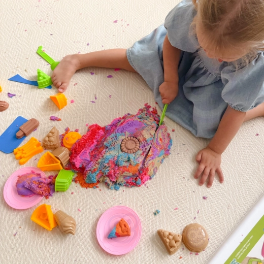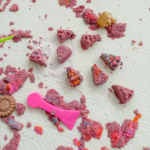 Poseban sastav pijeska je ugodan na dodir, lako se reže, valja i preša u kalupe, pritom se ne isušuje i drži oblik. Djeca mogu “kuhati” i posluživati deserte na tanjuriće, koristiti lopatice, nožiće i valjak te stvarati detaljne teksture pomoću prešica.
