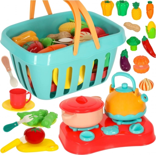 Ovaj bogat set omogućuje djeci pripremu „jela” od šarenog voća i povrća podijeljenog na dijelove koji se spajaju čičkom. Igra s nožićima i priborom pomaže pravilnom hvatu, koordinaciji oko–ruka i prirodno upoznaje s nazivima namirnica.