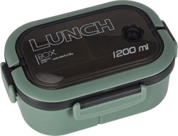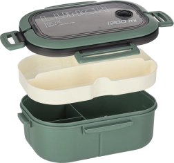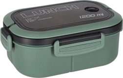 Praktična kutija za ručak 1200 ml s tri pretinca i nepropusnim poklopcem s 4 kopče održava užinu svježom i odvojenom. U setu je izvadiva razina, vilica i žlica. Prikladno za perilicu posuđa i mikrovalnu (bez poklopca), izrađeno od plastike bez BPA.