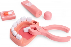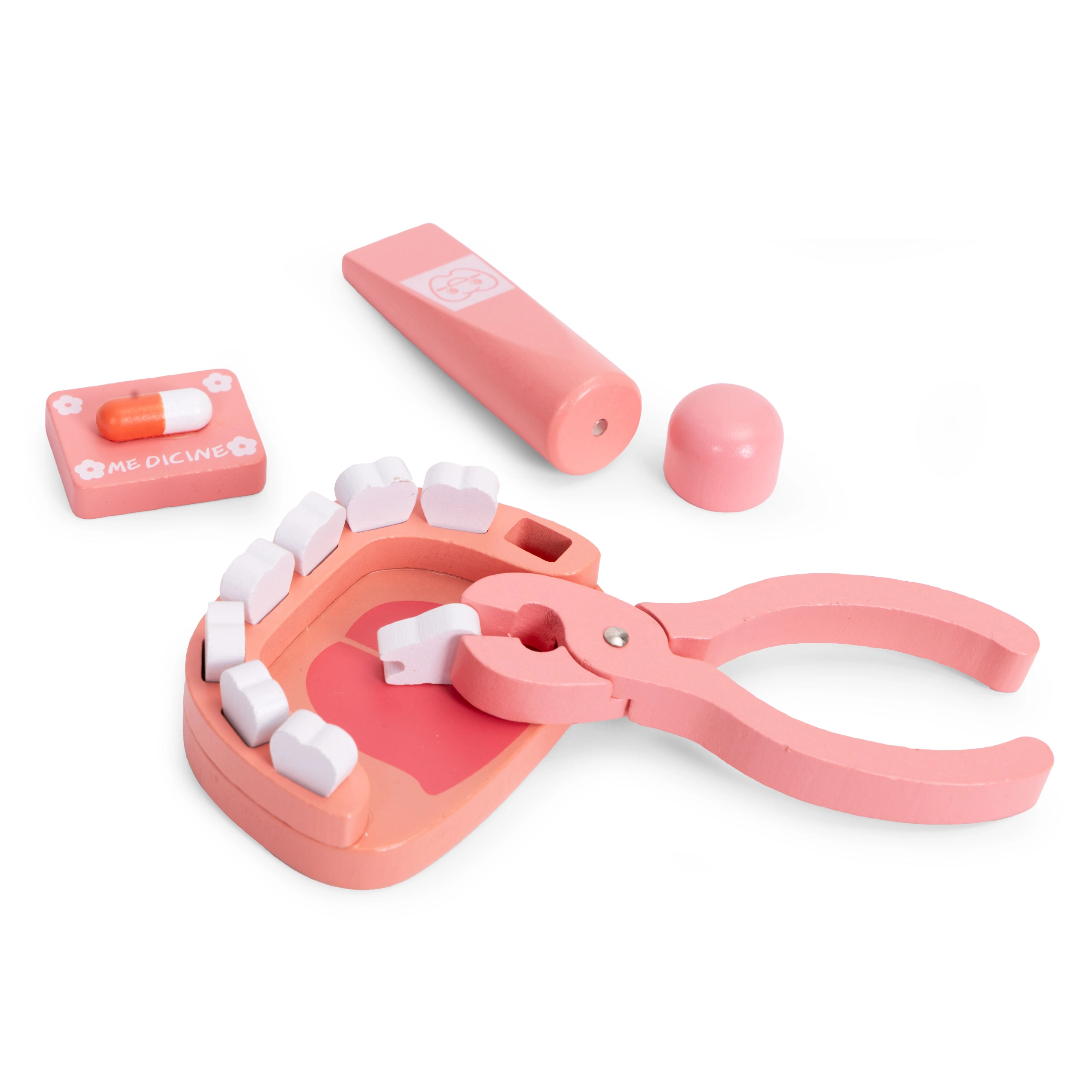 Ružičasti drveni zubni set s čeljusti i izvadivim zubima uči djecu pravilnim navikama oralne higijene i smanjuje strah od zubara.