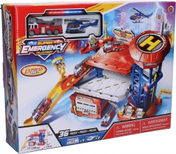 Sastavite vlastitu vatrogasnu bazu i krenite u akciju! Ova detaljno izrađena postaja s garažom ima 2 kata, funkcionalno dizalo i rampice za brz izlazak. Zahvaljujući preklopnim vratima, interventno vozilo je trenutačno spremno za akciju, dok helikopter polijeće s krova.