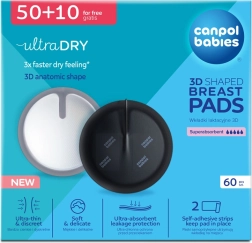 Canpol babies Ultra Dry 3D su jednokratni oblikovani ulošci za grudnjak namijenjeni mamama u kasnoj trudnoći i tijekom dojenja. Sedam zaštitnih slojeva i ultraapsorbirajuća jezgra brzo zaključavaju vlagu, dok prozračni materijali održavaju kožu udobnom bez iritacija. Tanko izvedenje (samo 1,3 mm) osigurava maksimalnu diskreciju i ispod pripijenog rublja.