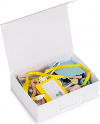 Svi su dijelovi izrađeni od izdržljivog drva u ugodnim pastelnim bojama i smješteni u čvrstom koferu za lako prenošenje i urednost. Zahvaljujući realističnoj izvedbi djeca uče brinuti se za druge, razvijaju maštu i koordinaciju oko-ruka.