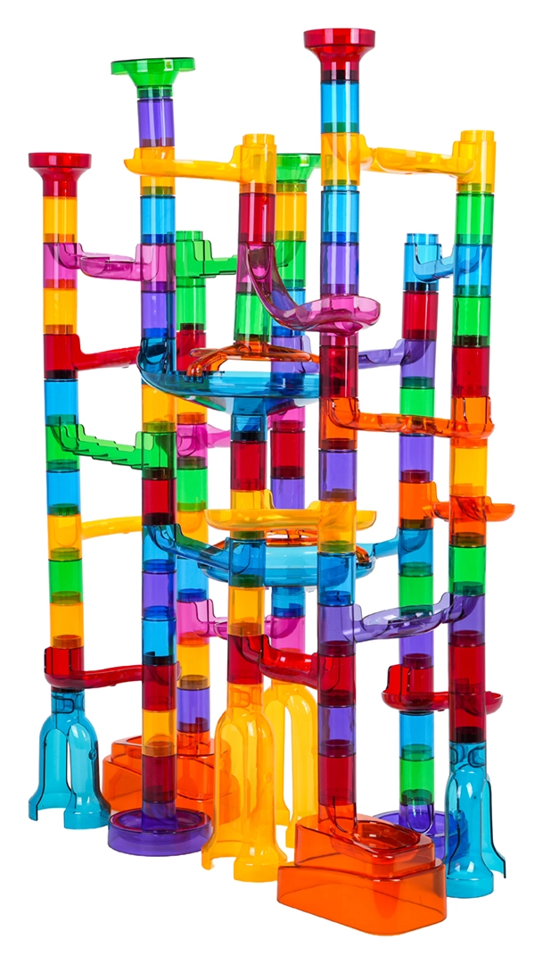 Međusobno spojivi dijelovi omogućuju lako slaganje visokih tornjeva, zavoja i spirala. Djeca mogu stalno mijenjati stazu i smišljati nove rute.