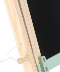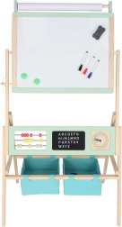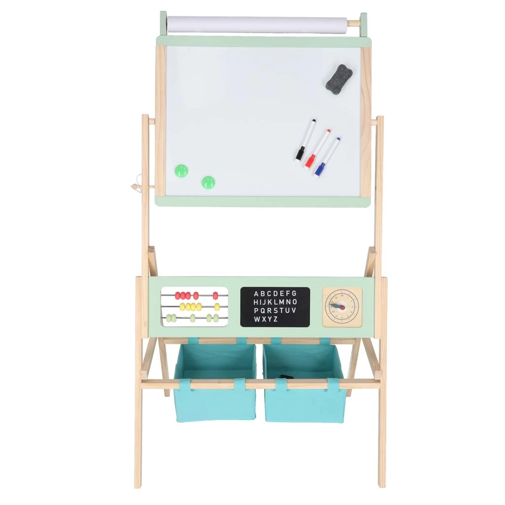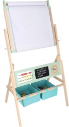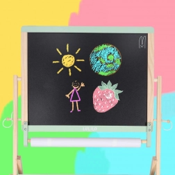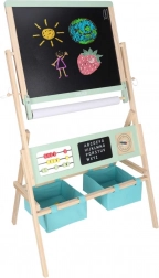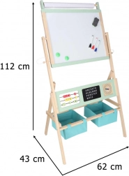Drvena konstrukcija je stabilna i izdržljiva, a dva tekstilna pretinca drže sav pribor pri ruci. Set uključuje i krede, voštane bojice, magnetske markere, spužvicu za brisanje te magnete – dovoljno je raspakirati i stvarati.