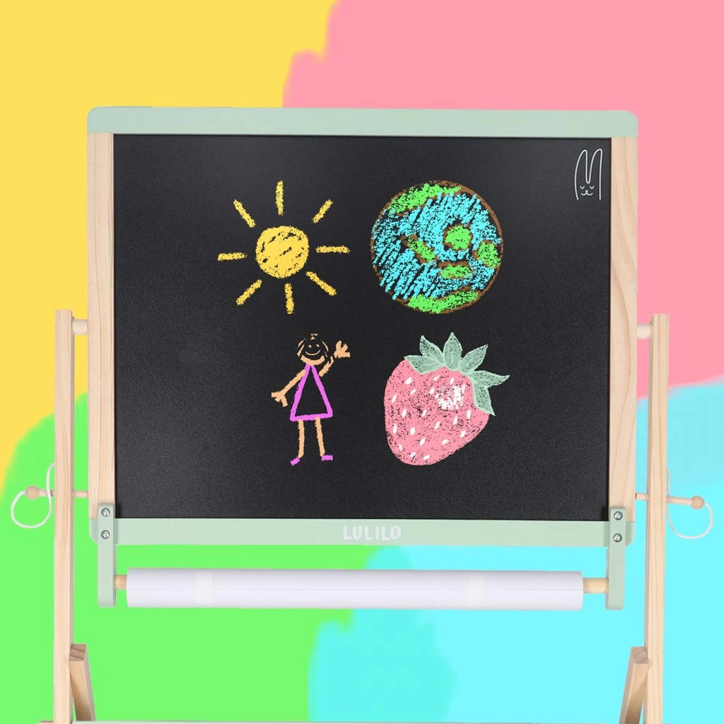 Otkrijte kreativni centar za djecu od 3 godine: obostrana drvena ploča 3u1 LULILO Kredo kombinira površinu za kredu, bijelu magnetsku ploču za suho brisanje i držač s rolom papira. U paketu je računalo (abakus), slova i brojke na magnetima, sat s pomičnim kazaljkama i dvije tekstilske košare za pohranu pribora. Idealno za pisanje, crtanje, računanje i učenje slova.