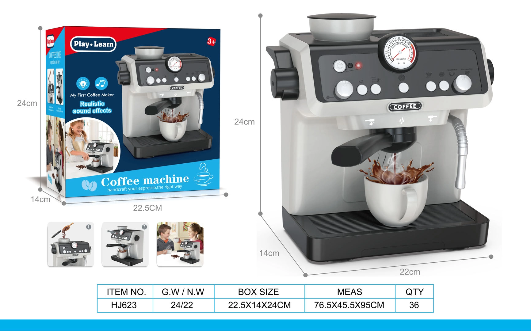 Realistični aparat za male bariste izrađen je od kvalitetne plastike s naglaskom na detalje. Nakon punjenja spremnika vodom i pomicanja ručke, čuju se autentični zvukovi mljevenja i kuhanja, a u priloženu šalicu se doista toči voda. Po završetku pripreme oglasi se signal, a kontrolno svjetlo se prebacuje s crvene na zelenu.
