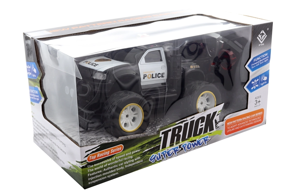 Policijski RC monster truck donosi djeci realističnu akciju s efektnom crno-bijelom policijskom grafikom, velikim gumama i svjetlećim farovima. Upravljanje na 27 MHz je intuitivno i prikladno za početnike – idealan izbor za prvi daljinski upravljani auto.