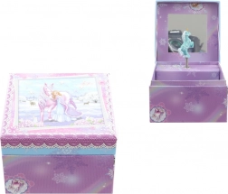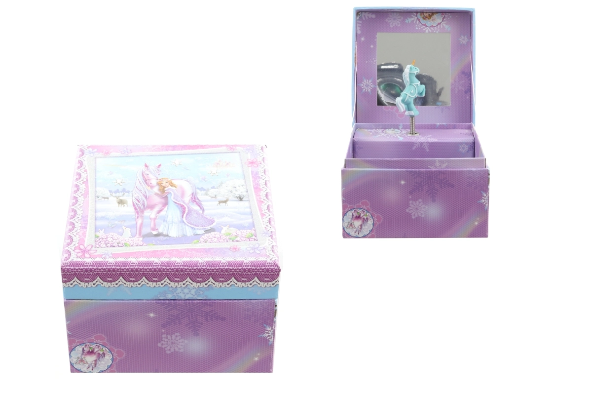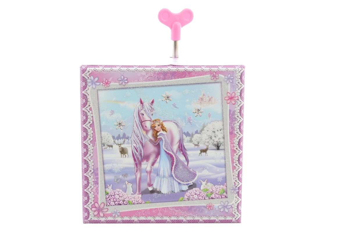 Očaravajuća glazbena kutijica za nakit s princezinim motivom i konjem pretvorit će svaku sobu u bajkovito kraljevstvo. Nakon navijanja ključa, figurica jednoroga se zavrti i elegantno pleše uz melodiju. Unutarnje ogledalce olakšava isprobavanje nakita i sitnica.