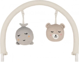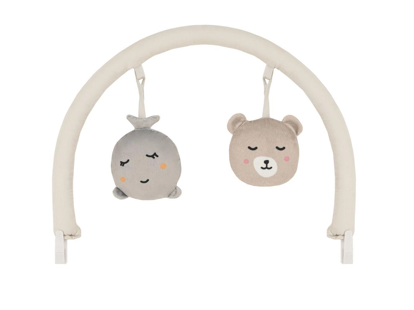 Odvojiva prečka s dvjema mekanim igračkama potiče vid, dodir i koordinaciju ruku i očiju.