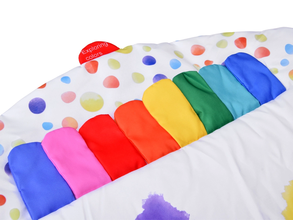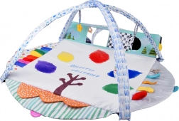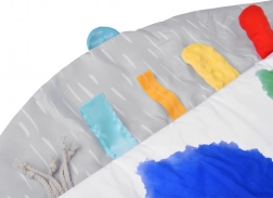 Ova velika, kružna dječja podloga nudi udobnu, podstavljenu površinu i varijabilnu upotrebu: kao igrovno gnijezdo s lukovima za vješanje igračaka ili kao samostalna podloga za slobodnu igru i vježbe na trbuhu. Visok kontrast uzoraka, raznolike teksture i nježni zvukovi prirodno stimuliraju osjetila te razvijaju finu i grubu motoriku.