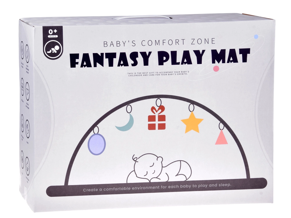 - Podloga, 2 luka, set visećih igračaka: zrcalce, kontrastne kartice, grickalice (zvjezdice), mekana kontrastna loptica, zvečka, šuškavi elementi