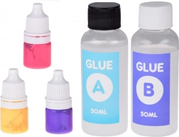 Set uključuje mjerice, posudice, otopine A i B, bojila, štapiće, perlice i vrećice – sve što je potrebno za miješanje, bojanje, ukrašavanje i pohranu sluzi.