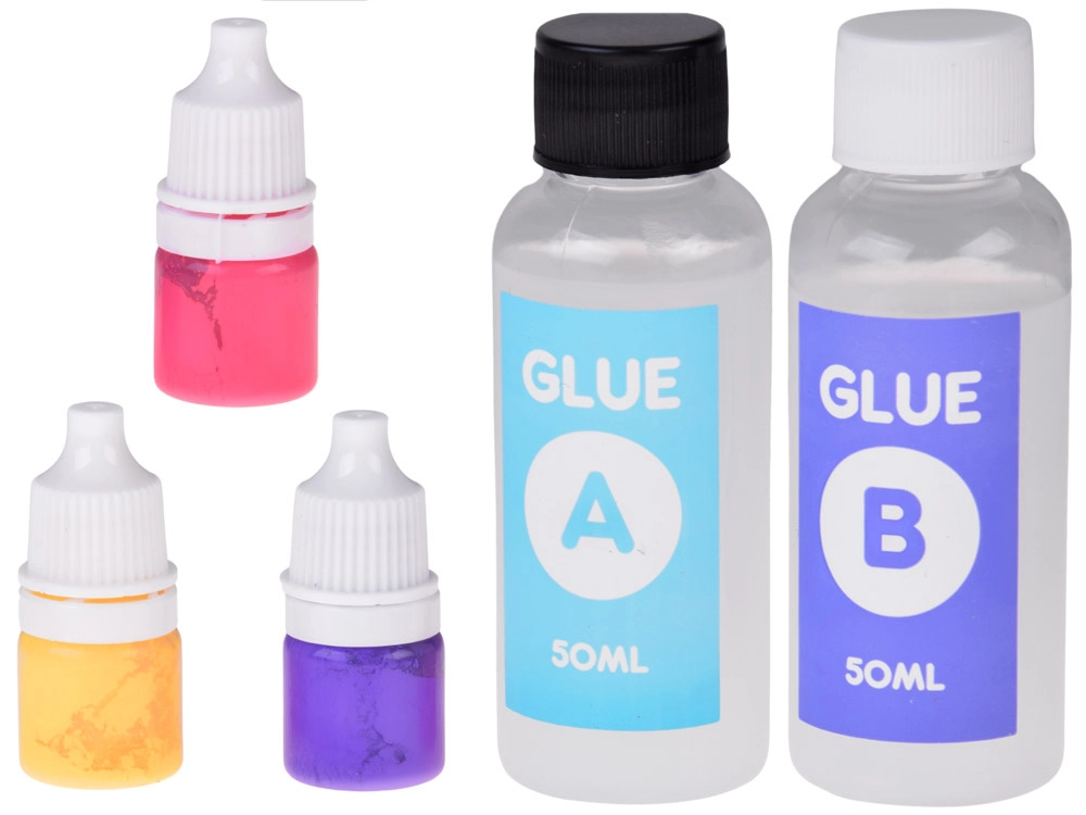 - Kalup za 2 sluzi, miješalica/štapić, pinceta, 2× ljepilo (A+B), mjerica, spužvica/aplikator, 3× bojilo, mekane dekorativne kuglice, zaštitne rukavice, 2× zvjezdica, 4× prozirna čašica, 2× ukrasna vrećica, 2× lančić za privjesak, tacna