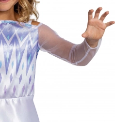 Službeno licencirani kostim od DISNEYJA donosi ikoničan izgled ELSE u nijansama svijetloljubičaste i ledenoplavе sa srebrnim akcentima. Haljina ima duge prozirne rukave, glatku satensku suknju s decentnim geometrijskim tiskom te ugodnu laganu, udobnu konstrukciju za cjelodnevno nošenje.