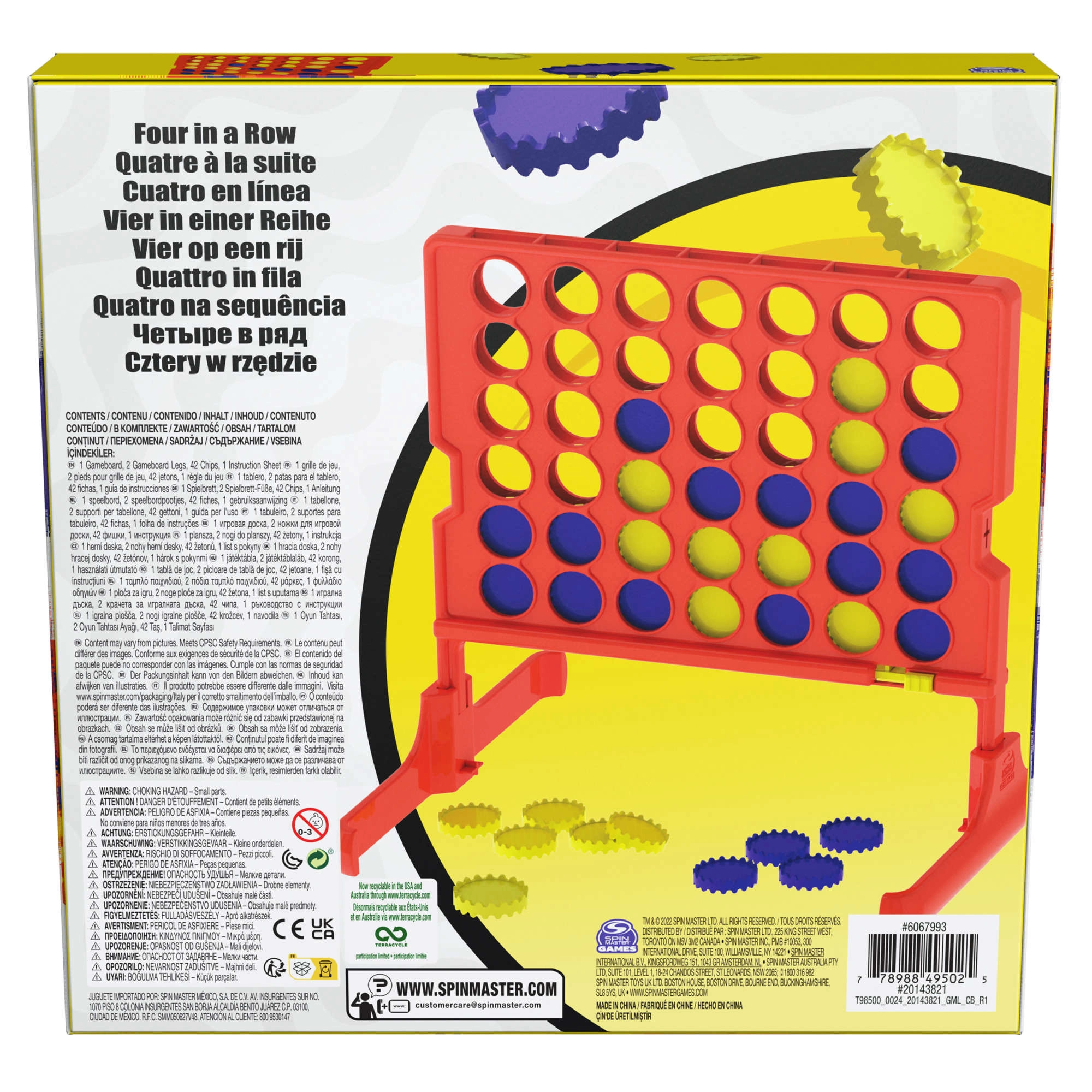 Paket sadrži crvenu stojeću ploču, dvije nožice za stabilnost, 42 žetona u žutoj i plavoj boji te upute. Zahvaljujući kvalitetnoj izradi brenda SPIN MASTER zajamčena je dugotrajnost i pri čestom igranju.
