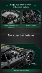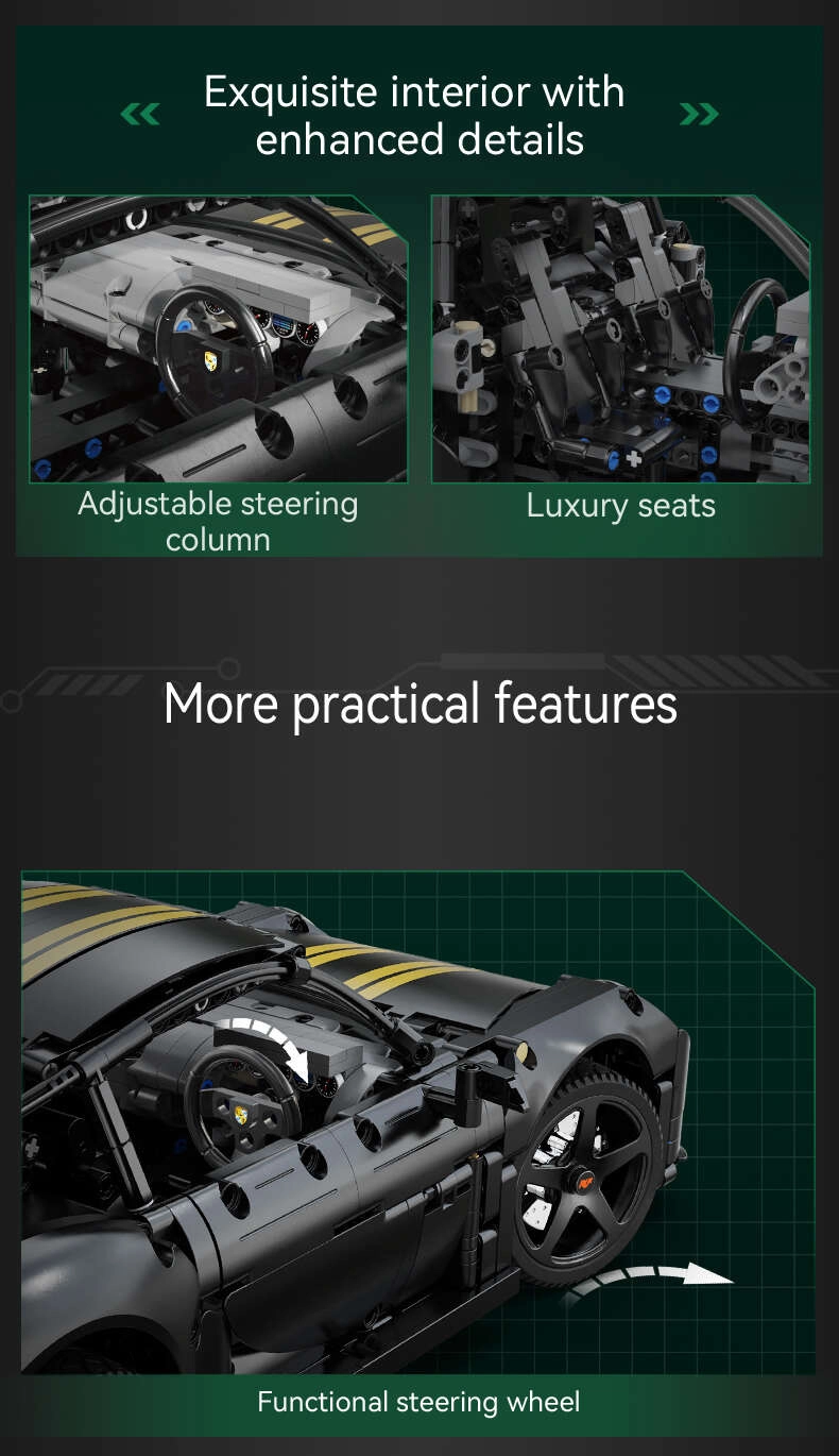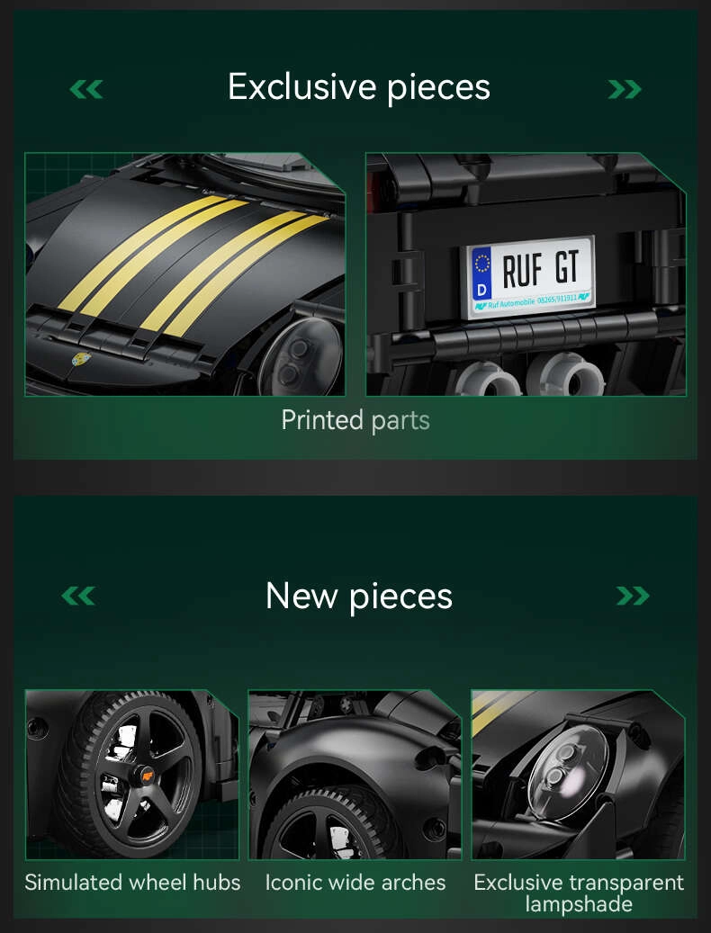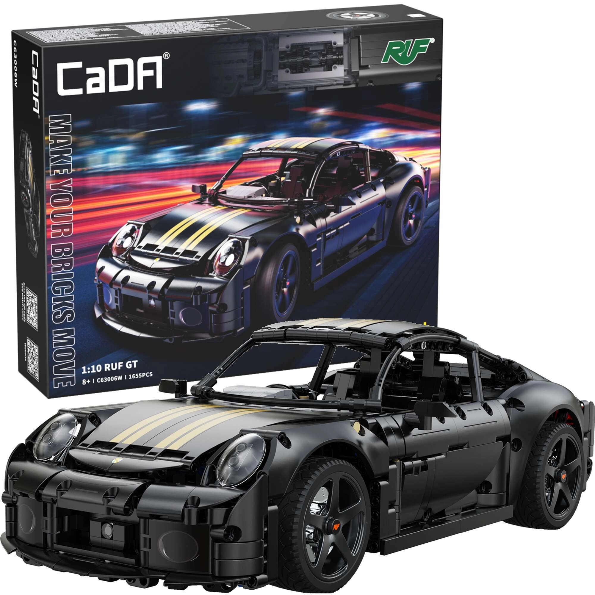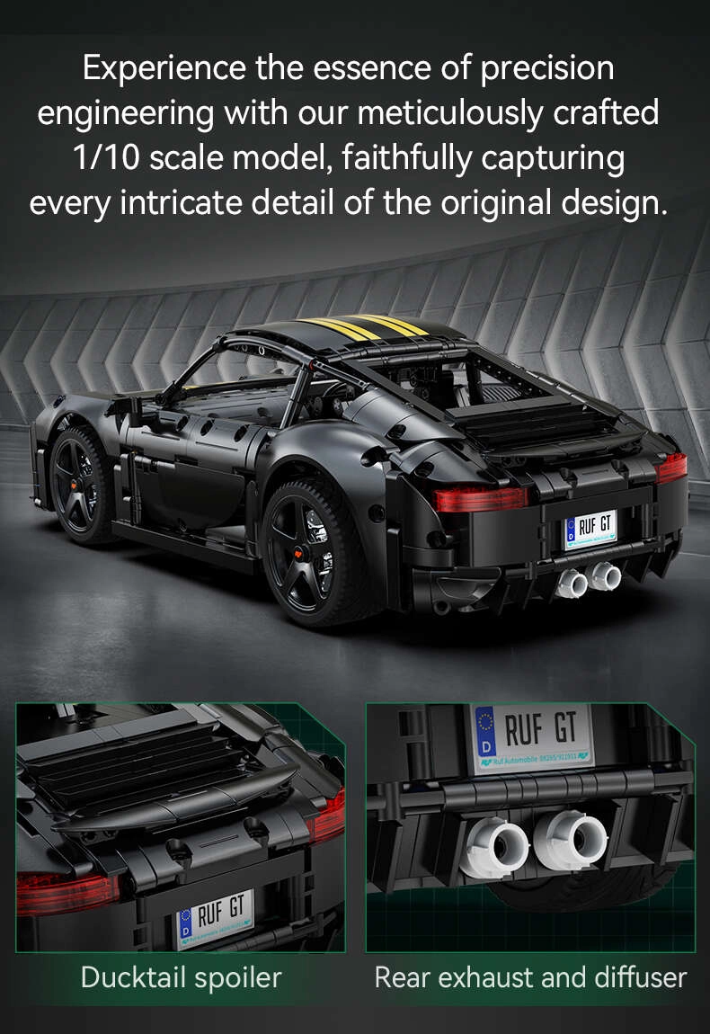 CaDA serija „Make Your Bricks Move“ oduševit će zahtjevne ljubitelje tehničkih modela. Precizno izrađen model RUF GT spaja realistične funkcije s privlačnim dizajnom: otvarajući elementi, upravljanje, ovjes i detaljna unutrašnjost. U mjerilu 1:10 ističe se kao kolekcionarski komad i kao akcijski model za igru.