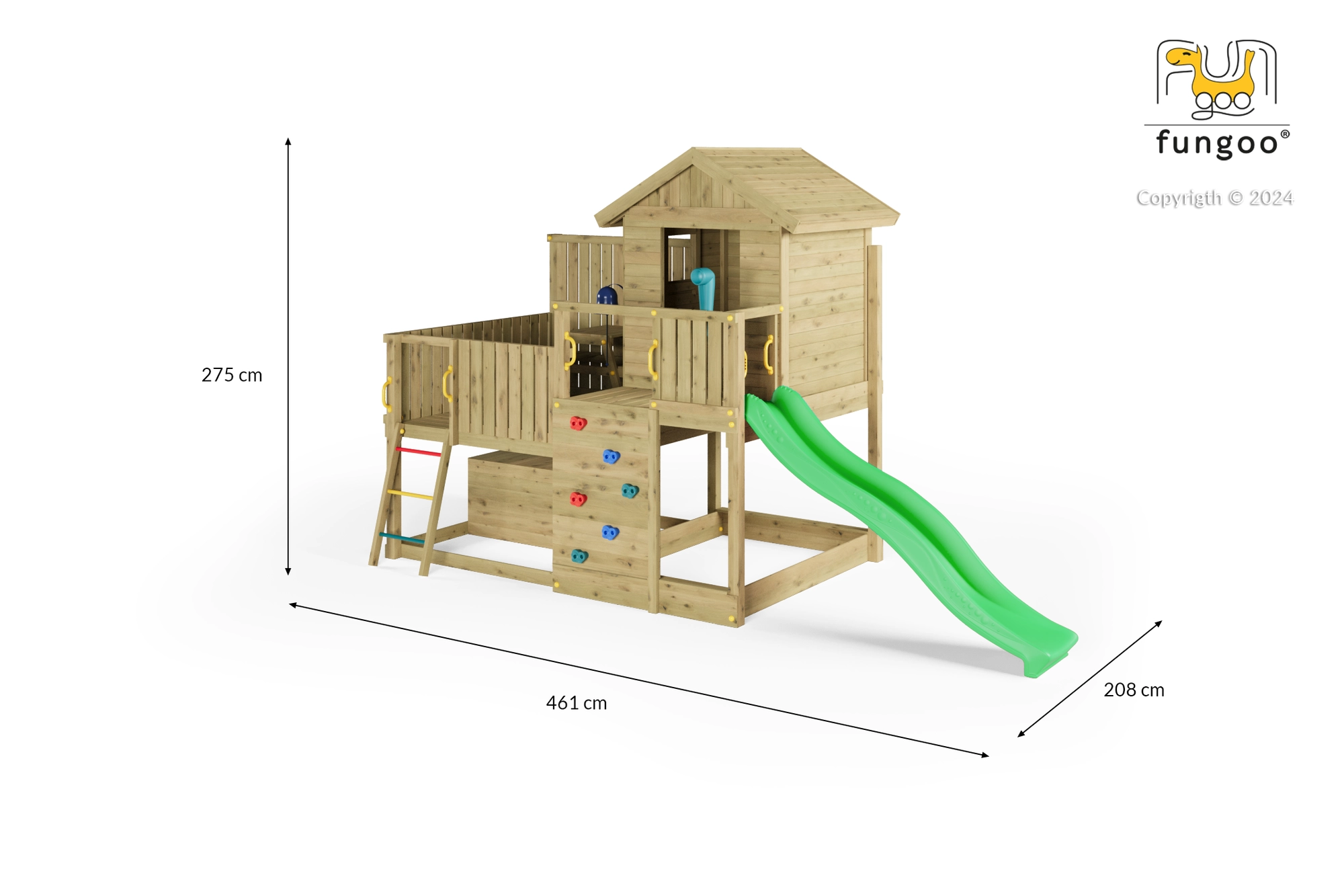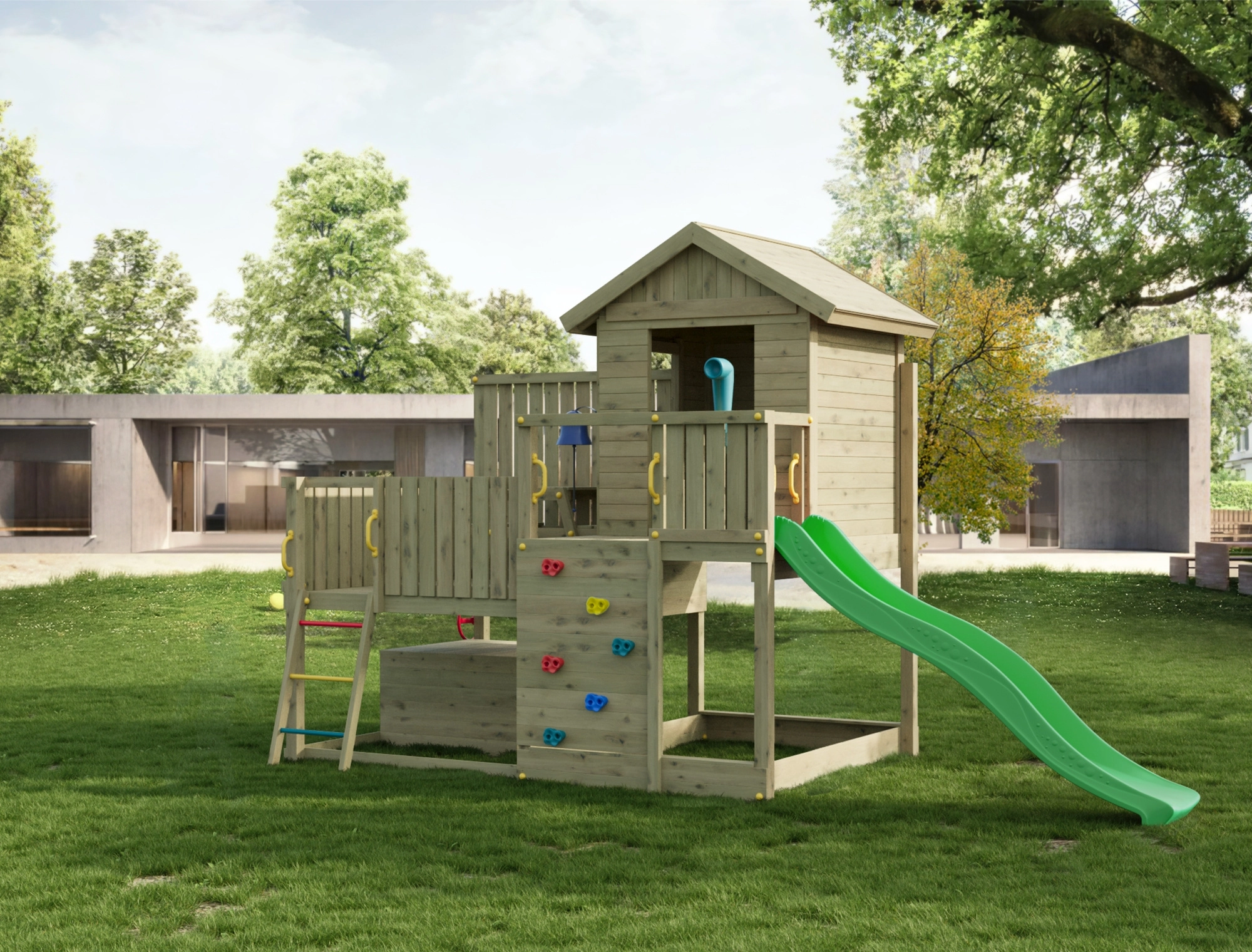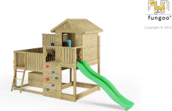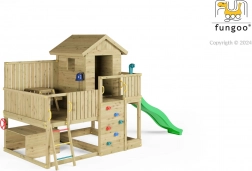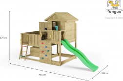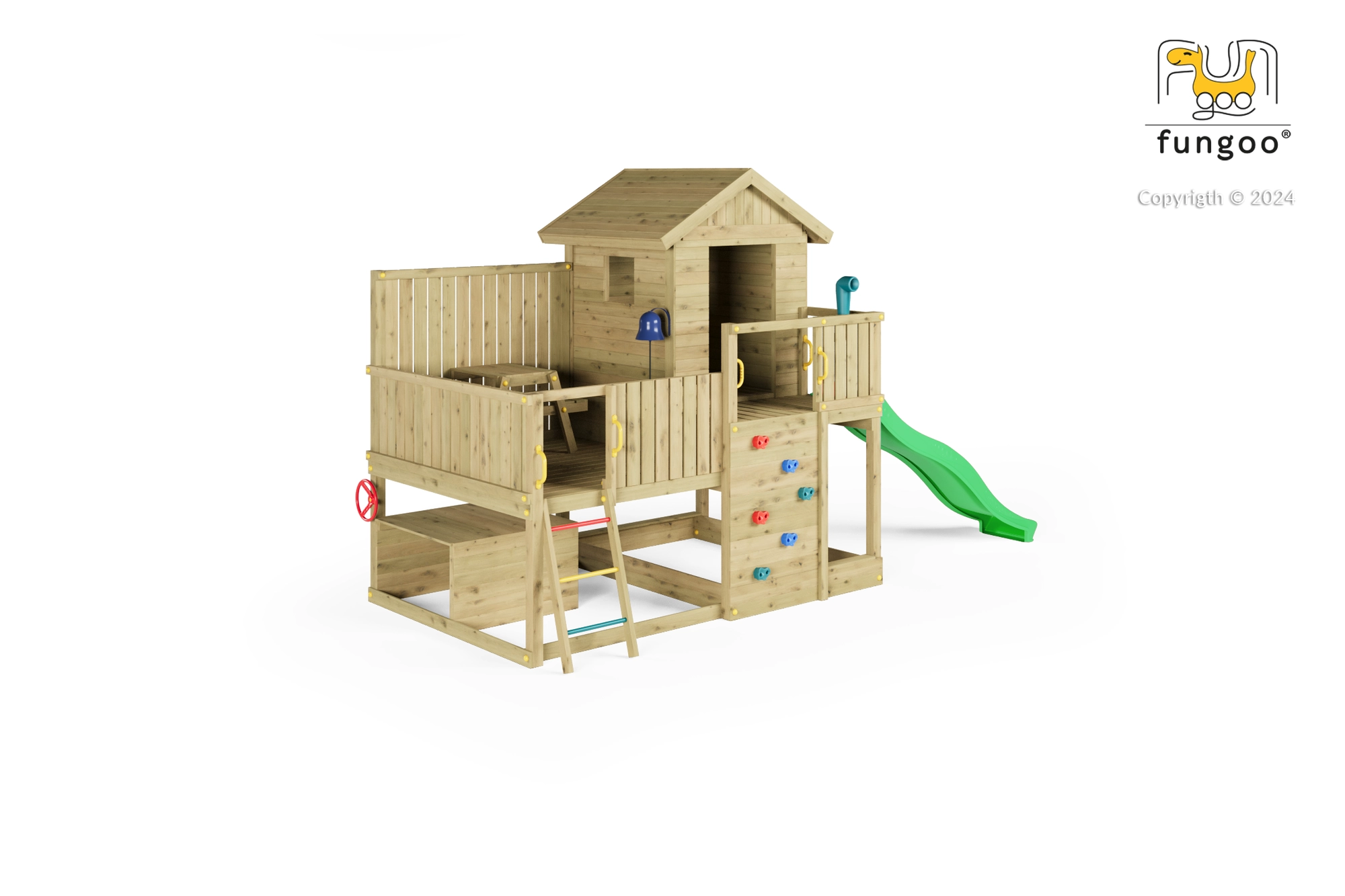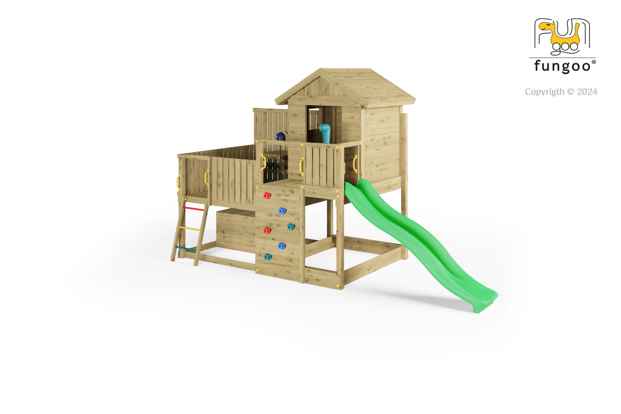 Igralište FUNGOO Sweet House promišljen je set za djecu od 3 godine koji spaja penjanje, spuštanje i kreativne aktivnosti. Natkrivena platforma s drvenim krovom stvara ugodnu kućicu za igre uloga, dok dugi zeleni tobogan i penjački zid s obojenim hvatištima potiču prirodno kretanje i razvoj koordinacije. Donji pješčanik i piknik stolić pozivaju na odmor i senzornu igru.