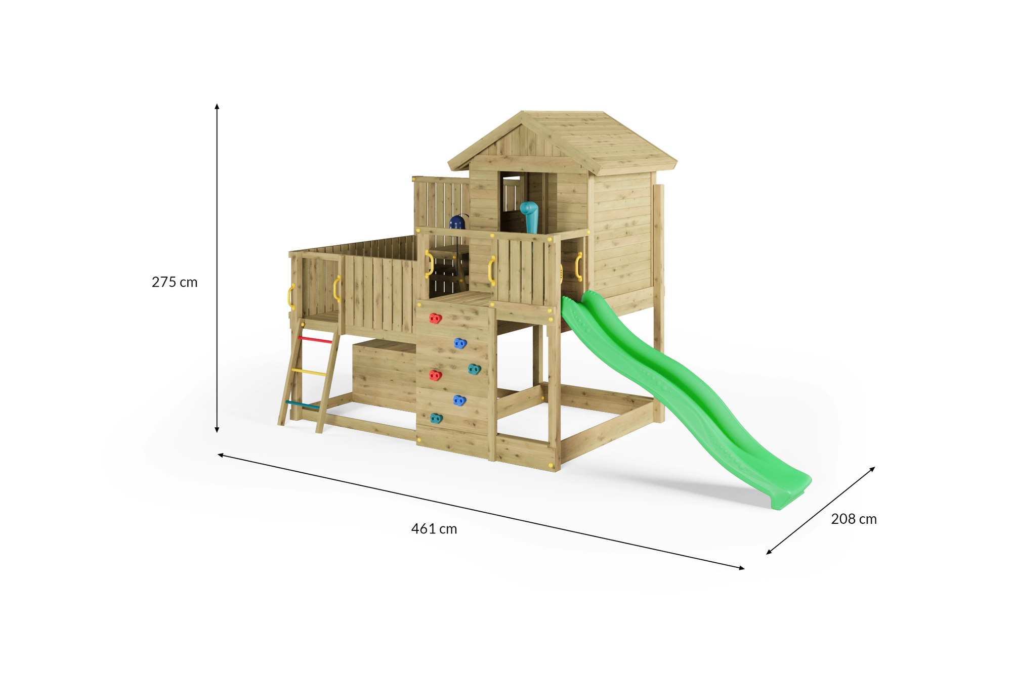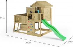 Masivno drvo s tlakovitom impregnacijom KDI osigurava dug vijek i otpornost na vremenske uvjete. Sigurnost pojačavaju ručke, ograda i protuklizne ljestve. Zahvaljujući kapacitetu do 10 djece, set je idealan za braću, sestre i prijatelje – svatko će pronaći svoju zabavu bez čekanja.