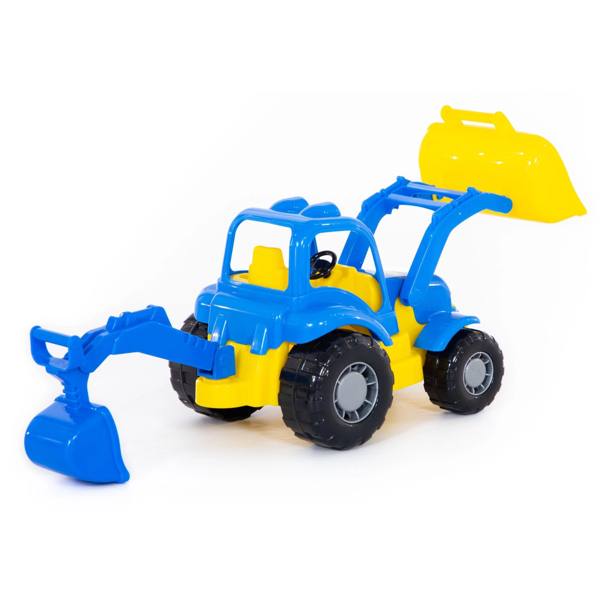 Ovaj plastični traktor bager veličine 28 cm odličan je izbor za male graditelje. Zahvaljujući pokretnim rukama i lopatama može zahvaćati, premještati i istresati materijal te potiče razvoj mašte i fine motorike. Izdržljiva konstrukcija osigurava dug vijek trajanja pri svakodnevnoj igri.