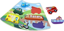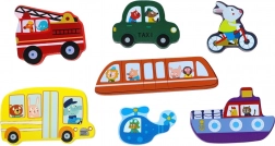 Zabavne drvene umetajuće puzzle s motivom prijevoznih sredstava razvijaju finu motoriku i logičko razmišljanje djece od 18 mjeseci. Sadrži 7 oblikovanih dijelova koji točno pristaju u podlogu i mogu se koristiti i samostalno tijekom igre. Puzzle su povezive s drugim motivima i omogućuju stvoriti šareni kružni prizor s prometom, životinjama ili podmorskim svijetom.