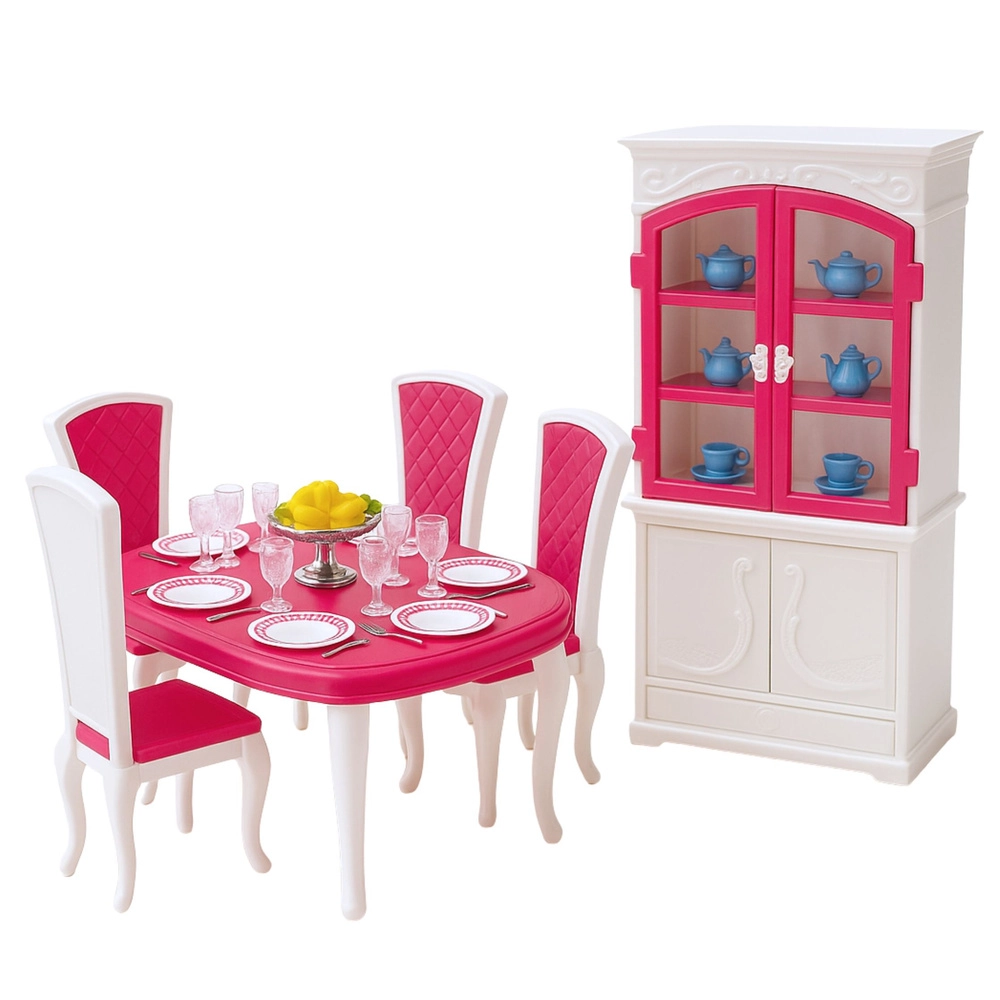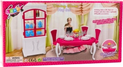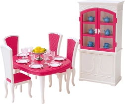 Stvorite svojim lutkama ugodno mjesto za zajedničke obroke i svečane gozbe. Središte seta je prostrani stol sa stolicama, dopunjen kredencom s vratima koja se otvaraju za pohranu posuđa. Bogata oprema tanjurića, šalica, pribora i dekoracija omogućuje djeci osmišljavanje bezbroj scenarija i razvoj mašte.