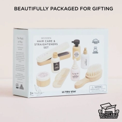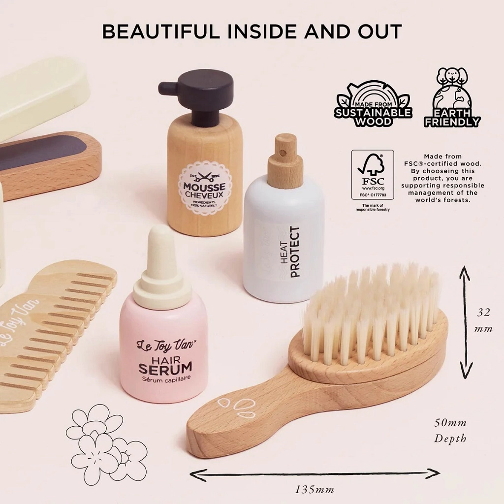Dječji frizerski set Le Toy Van donosi sate kreativne zabave za male stilistice i stiliste. Sadrži 8 kvalitetnih drvenih dijelova uključujući peglu za kosu, četku, češalj i kozmetičke dodatke za maštovitu njegu kose. Izrađen je od FSC certificiranog drva, ručno dotjeran netoksičnim, vodenim bojama i udovoljava strogim sigurnosnim standardima. Razvija maštu, socijalne vještine i finu motoriku djece od 3 godine naviše.