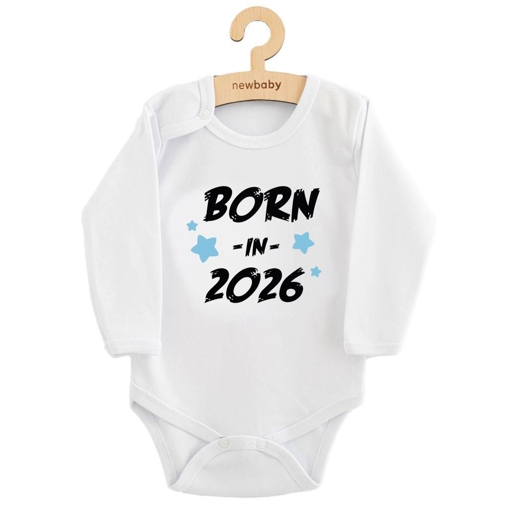 Mekani pamučni bodi s dugim rukavima brenda New Baby s natpisom BORN IN 2026 i plavim zvjezdicama. Nježan prema dječjoj koži, boje s certifikatom OEKO-TEX STANDARD 100. Praktično kopčanje na drukere na ramenu i između nogica za lako odijevanje i prematanje. 100% pamuk za udobnost i toplinu tijekom cijelog dana.