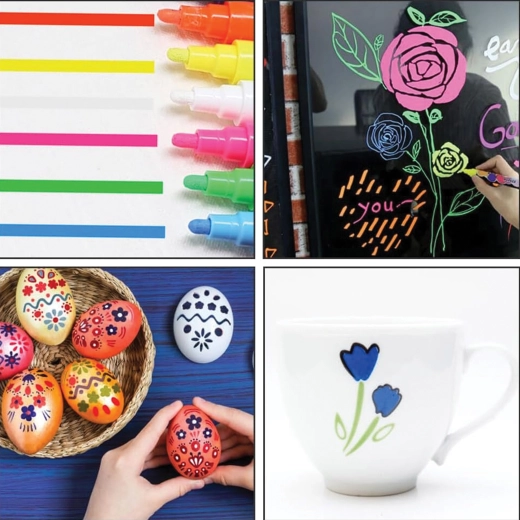 Markeri pišu neprozirno na raznim glatkim materijalima: izlozima, šalicama, tanjurima, dekoracijama ili uskrsnim jajima.