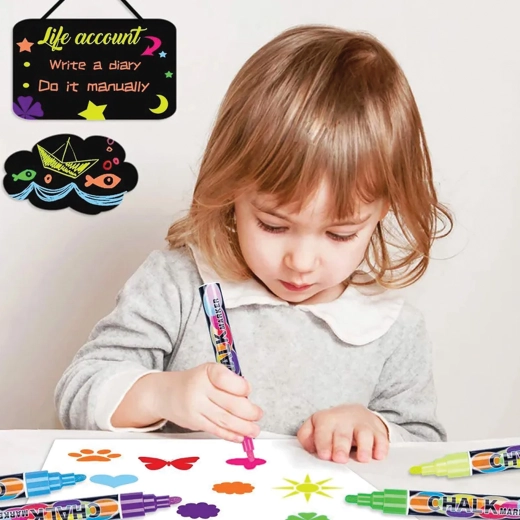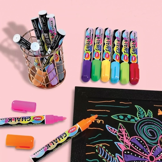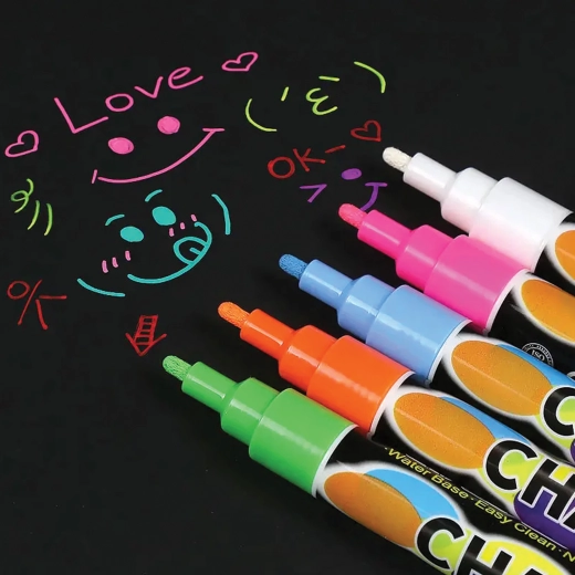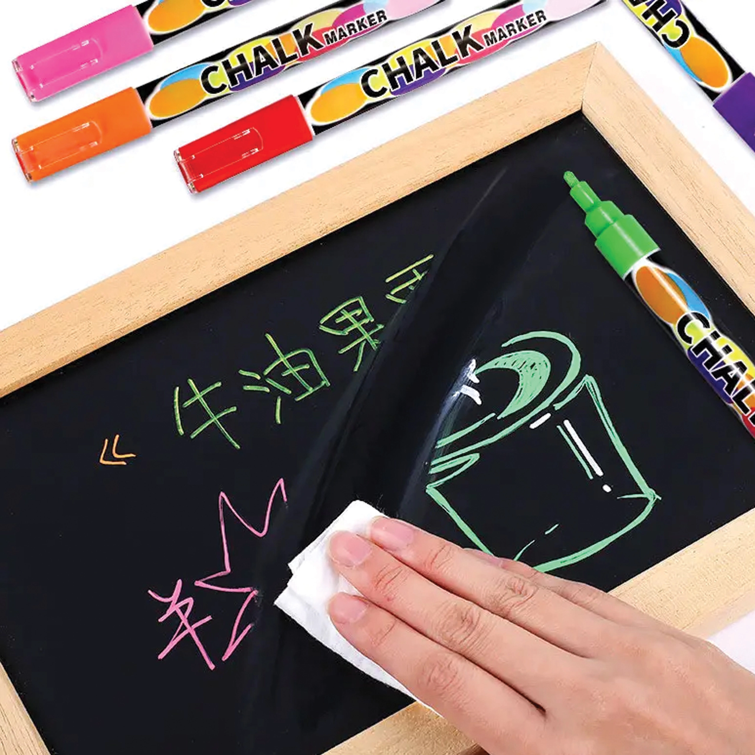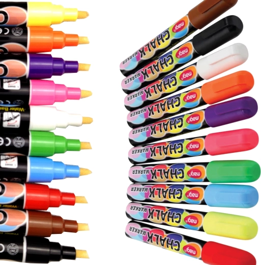 Otkrijte praktičnu alternativu klasičnoj kredi. Tekuća kredna tinta se odlično prihvaća na glatkim površinama (ploče, staklo, metal, keramika) i pritom se lako briše vlažnom krpom bez ostataka prašine. Markeri su prikladni za nastavu, poslovne sastanke, ploče s jelovnicima, svadbene dekoracije i dječje stvaralaštvo.
