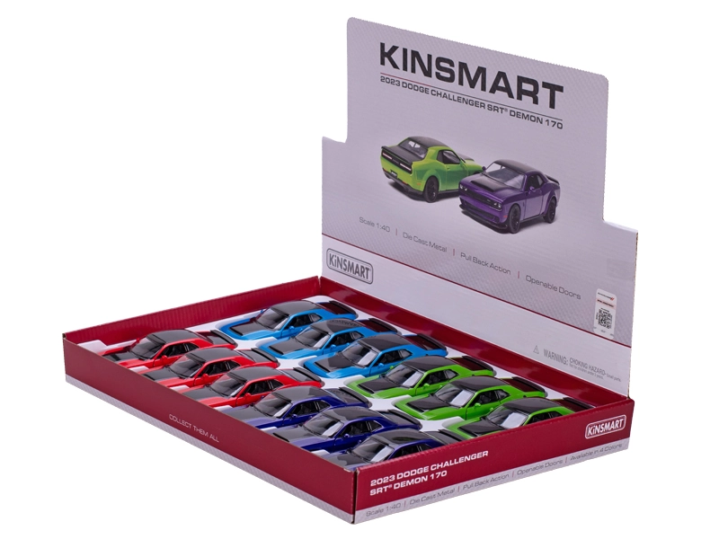 Precizno izrađen metalni model legendarnog muscle cara DODGE CHALLENGER SRT 170 marke Kinsmart u mjerilu 1:40 oduševit će male i velike ljubitelje automobila. Nudi autentične detalje, mehanizam povratnog kretanja za vožnju naprijed nakon navijanja i otvarajuća vrata s detaljno izrađenom unutrašnjosti. Zahvaljujući kombinaciji metala i plastike izdržljiv je, lagan i prikladan za djecu od 3 godine. Dostupan u 4 izražajne boje.