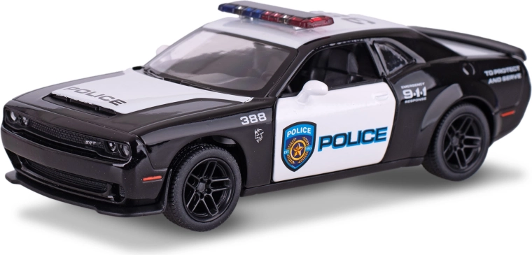 Detaljno izrađen metalni model Dodge Challenger SRT Demon 170 u policijskoj izvedbi marke Kinsmart oduševit će djecu i kolekcionare. U mjerilu 1:40 i s duljinom 13 cm nudi realistične proporcije, povratno navijanje za brzu vožnju i otvarajuća vrata za još veću autentičnost. Izdržljiva kombinacija metala i plastike osigurava dug vijek trajanja i atraktivan izgled.