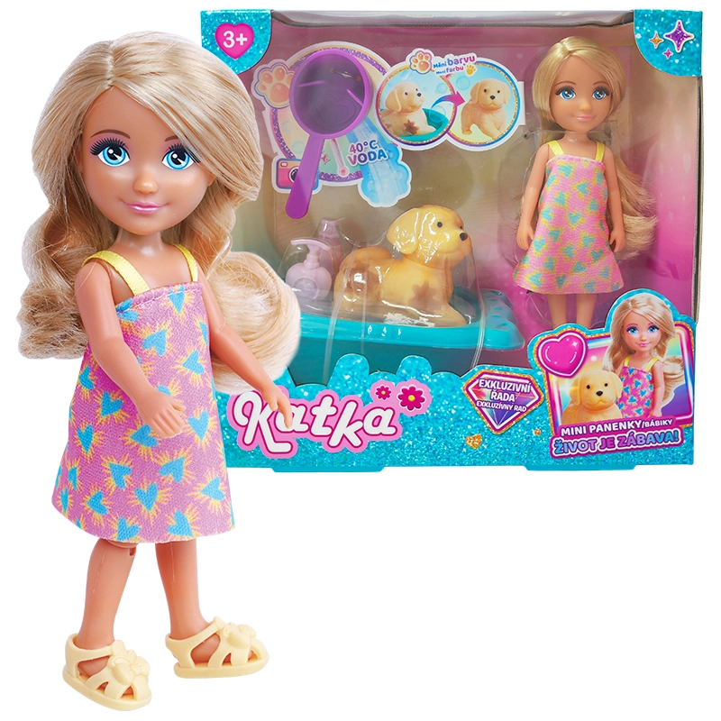 Set Lutka Katka sa psom i kadom razveselit će svaku malu njegovateljicu. Lutka ima dugu kosu pogodnu za češljanje i šarenu odjeću, pseći prijatelj potiče osmišljavanje priča, a kada u veselim bojama upotpunjuje rituale kupanja lutke. Zahvaljujući kvalitetnim materijalima, igra je sigurna i izdržljiva za svakodnevnu upotrebu.