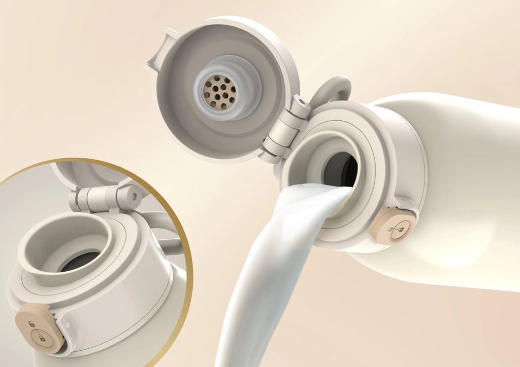 Brtveni poklopac sa zaključavanjem sprječava prolijevanje u torbi, a oblikovani izljev osigurava čisto i precizno točenje bez kapljanja.