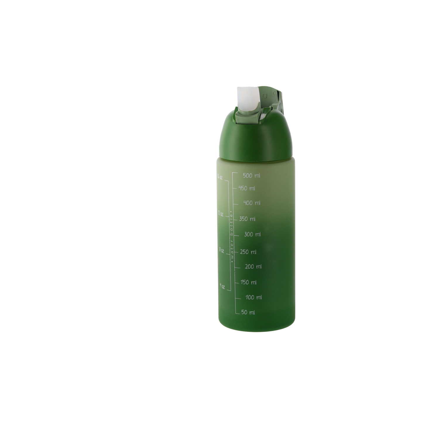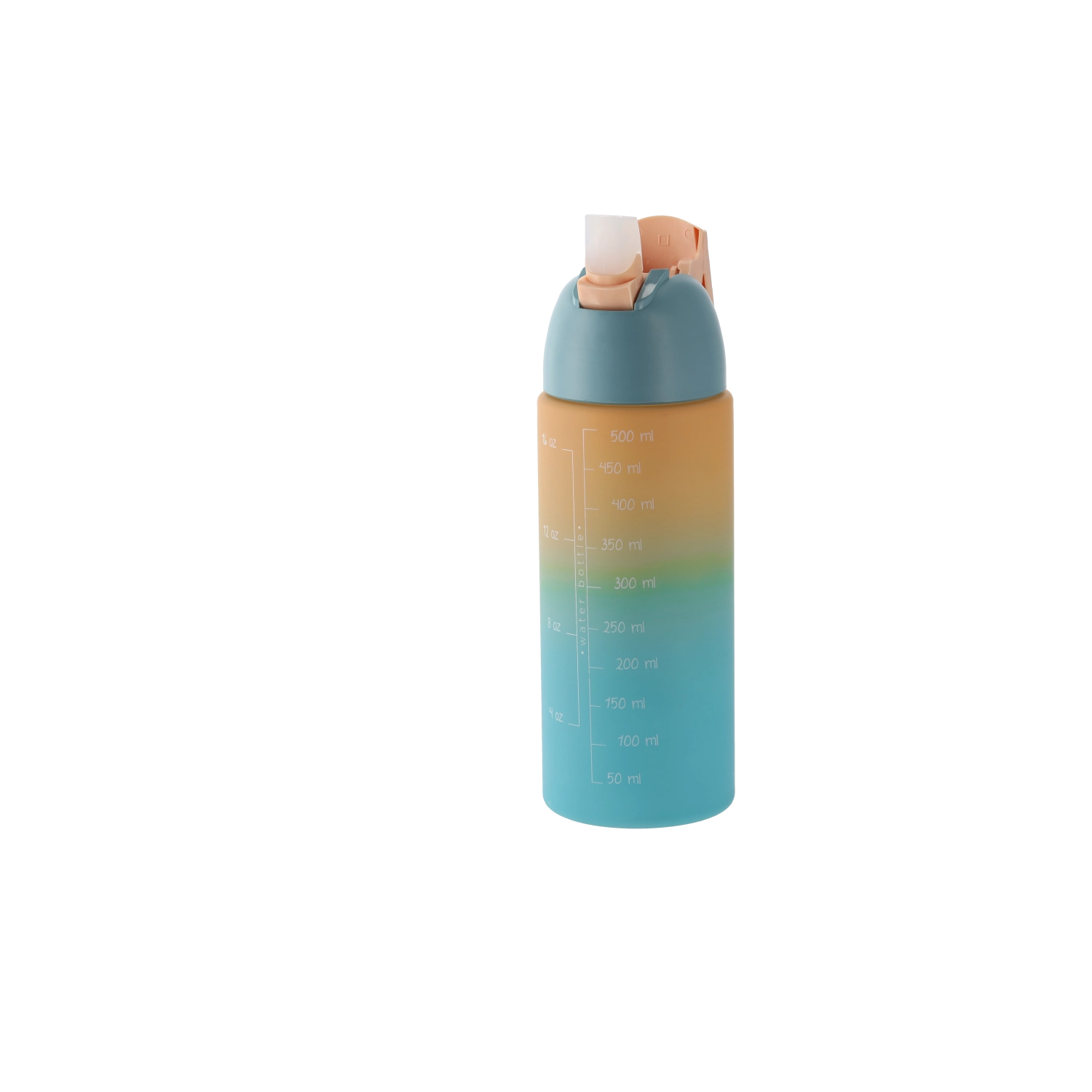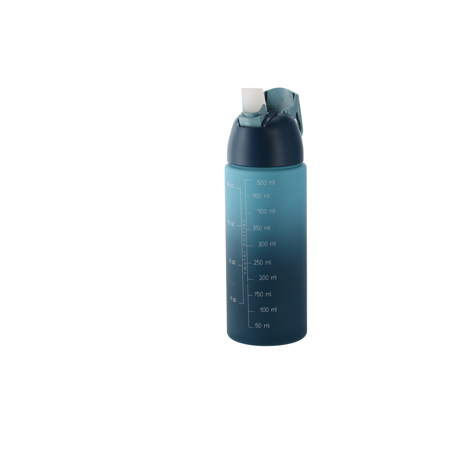 Stilna sportska boca za piće zapremnine 500 ml u plavom ombre izvedenju idealna je za svakodnevnu hidrataciju kod kuće, na poslu i tijekom sporta. Zahvaljujući flip-top poklopcu i nepropusnom zatvaraču udobno se pije bez prolijevanja, prozirno tijelo s mjerilnom skalom pomaže pratiti unos tekućine. Lagani i izdržljivi materijal PC prikladan je za putovanja i ruksak.