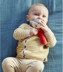 Zvečkalo je izrađeno od organskog GOTS certificiranog pamuka i bojeno bojama na biljnoj bazi, pa je nježno prema dječjoj koži i okolišu. Odlično za svakodnevnu igru i kao zabava na putovanjima.