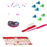 Češalj, četka, perlice, ukosnice, vrpce, naljepnice, paleta "make-upa"