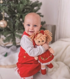 Tkanena lutka Mandie šarenih boja i mekog dodira divna je prijateljica za najmlađe. Topli tekstili, nježna kosa od pređe i simpatičan osmijeh mame na maženje i igru. Stilska karirana haljinica s vezom i čipkom daje lutki tradicionalni šarm koji djeca vole.