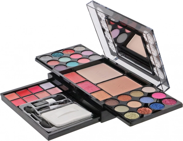 - 16× sjenila za oči, 8× kremasto sjajilo za usne, 8× krema sa šljokicama, 2× puder, 1× aplikator/kist (3u1), integrirano ogledalo