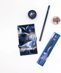 Stilsky školski set s motivom Jurassic World donosi sve potrebno za pisanje i bilješke: olovku, oblikovanu gumicu, kutijicu za šiljilo, ravnalo i oblikovani blok za bilješke.