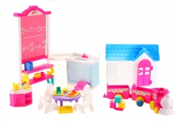 Velika ploča s policama, umivaonik, kućica s vratima koja se otvaraju, 4 dječja stolčića, dječji stolić, dječje kuhalo, dječji vlakić s 3 vagona, dodaci i posuđe