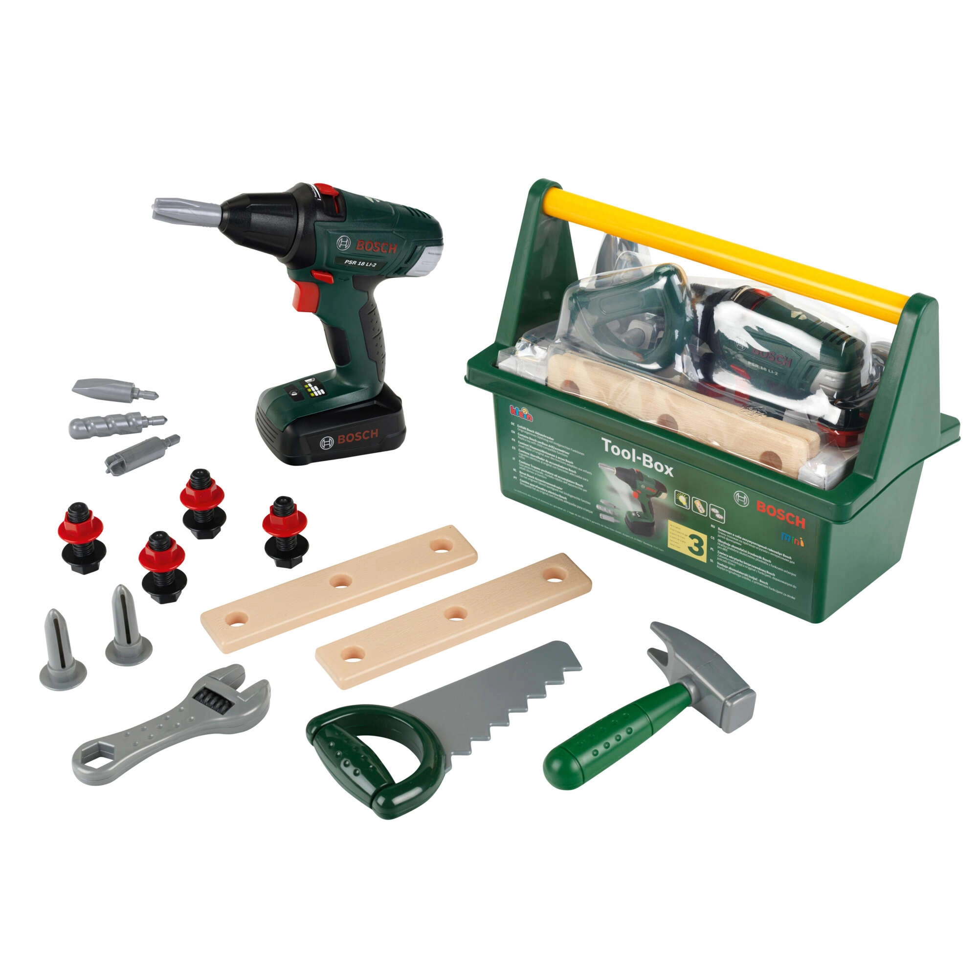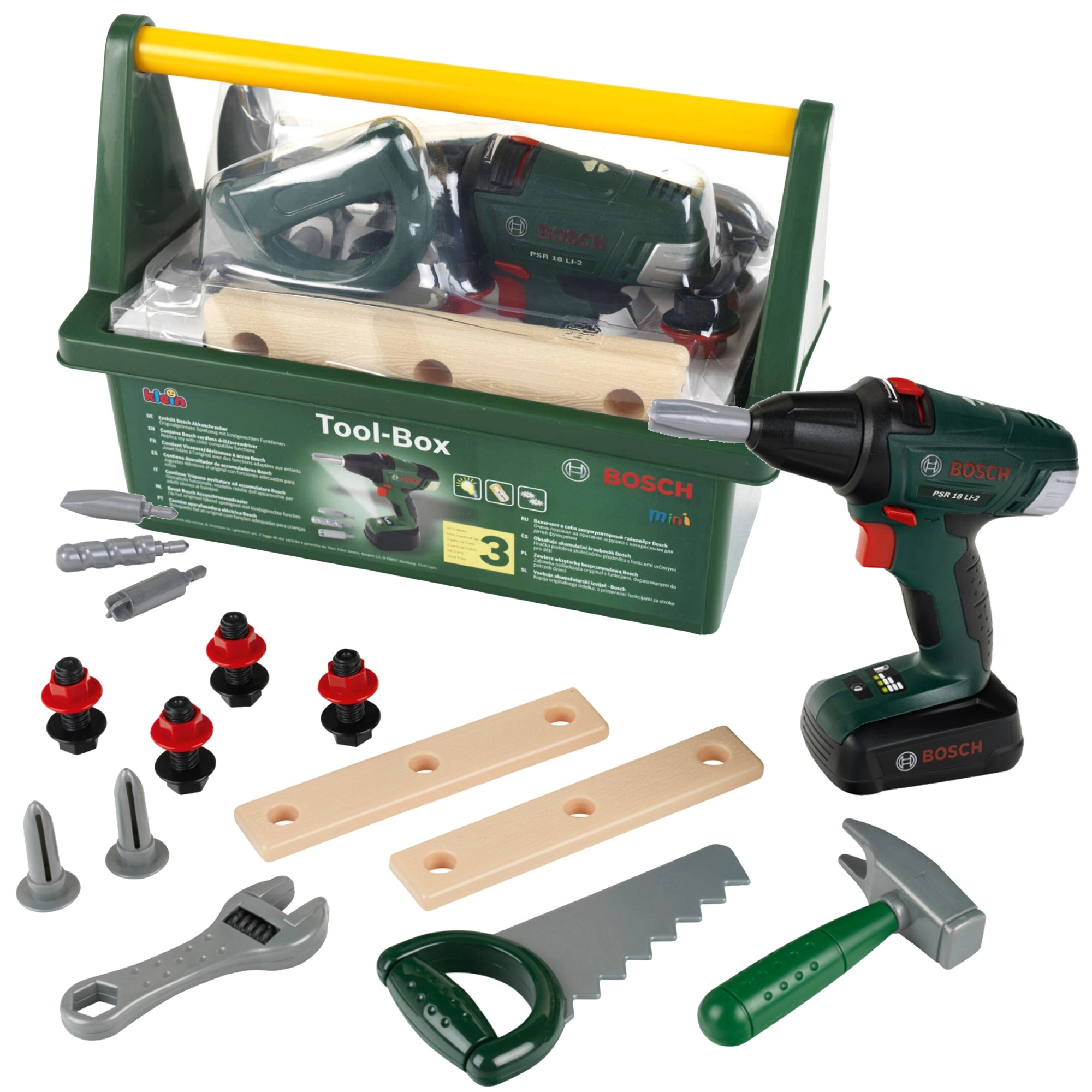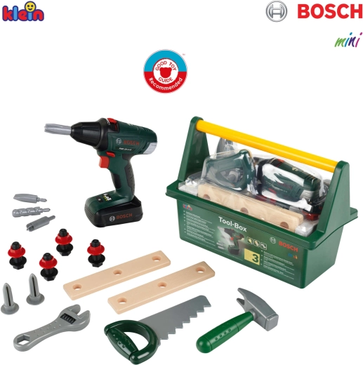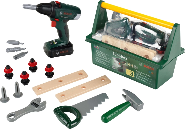 Ovaj kvalitetan dječji set nastao je u licenci BOSCH i dizajniran je tako da vjerno oponaša pravi alat, a pritom je u potpunosti siguran za djecu. Robusna, tamnozelena kutija za alat s udobnom žutom ručkom drži sve dijelove uredno na okupu i olakšava prenošenje.